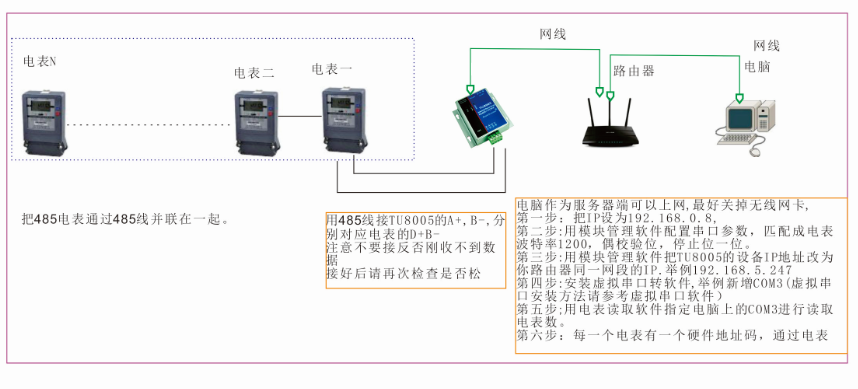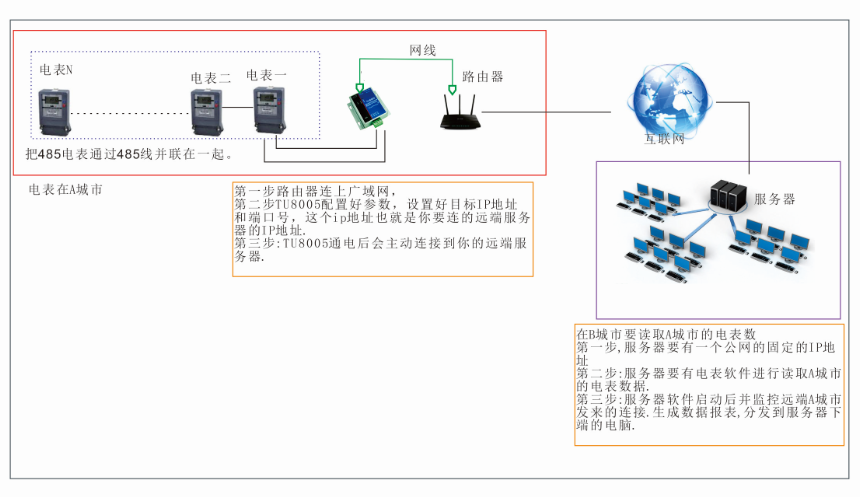 3.数据中心:通过无线网络与DTU建立连接,从电表终端读取电量数据,实现远程抄表。