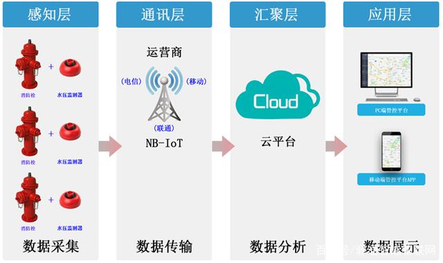 智能室外消防栓水压监测物联网云平台采用功能服务模块化的系统架构,以满足业务应用和处理能力的线性扩展要求。系统逻辑架构分为四层,分别是感知层、通讯层、汇聚层、应用层,系统架构内容如下: